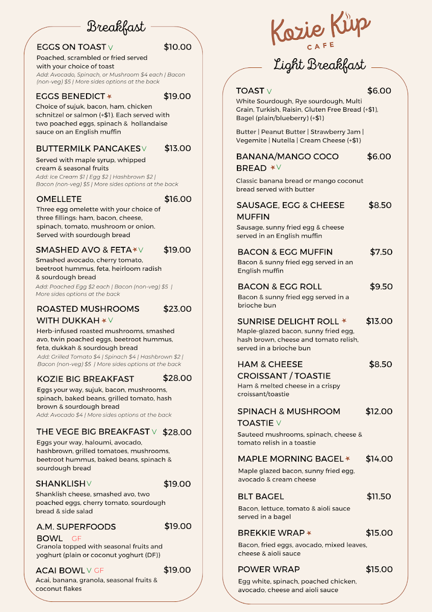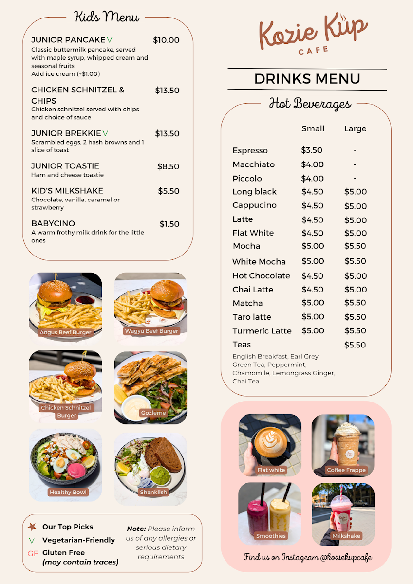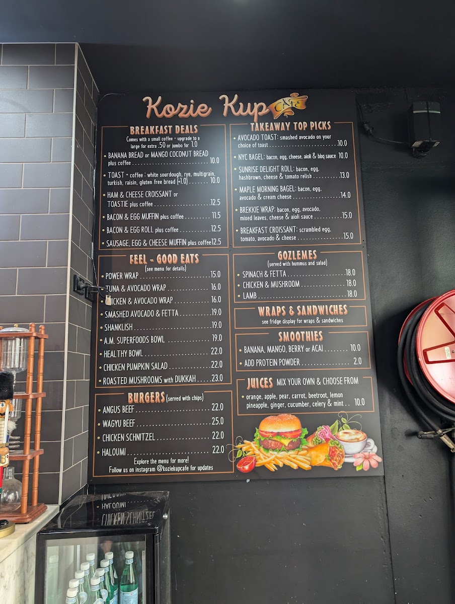 The beverage selection is equally impressive, showcasing expertly crafted hot drinks—from rich, aromatic espressos and smooth long blacks to uniquely flavored lattes like matcha, taro, and turmeric. Customer feedback highlights the quality and balance of their coffee, praising its smoothness and depth without being overly sweet. Overall, Kozie Kup delivers a warm, inviting experience with dishes and drinks crafted for those who appreciate both flavour and finesse.